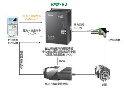 油壓驅(qū)動技術(shù)是目前射出成型機使用最廣泛的驅(qū)動控制方式,具有功率重量比大、壓力和流量控制佳、壽命長及易維護等優(yōu)點;而交流伺服馬達驅(qū)動技術(shù)則具有響應快、精度高、恒轉(zhuǎn)矩等優(yōu)點。臺達VFD-VJ系列油電伺服驅(qū)動器利用交流伺服馬達驅(qū)動的油壓系統(tǒng),將伺服驅(qū)動技術(shù)、馬達技術(shù)與油壓技術(shù)結(jié)合,且以精確的壓力與流量控制,消除高壓節(jié)流的能源損耗,將射出成型機油壓驅(qū)動技術(shù)再度創(chuàng)新。此外,臺達在倡導綠色設(shè)計的理念及領(lǐng)先的環(huán)保技術(shù)上,亦提升了產(chǎn)品綠色制造的技術(shù)水平,為客戶創(chuàng)造更多價值。